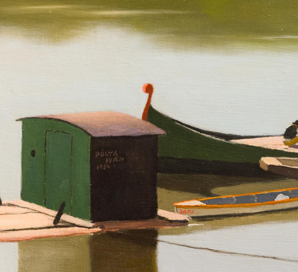 Pólya Iván (1889-1939): Bárkák a Tiszán, olaj, karton, jelzés középen balra, keretben, 40x50 cm 300 000 Ft