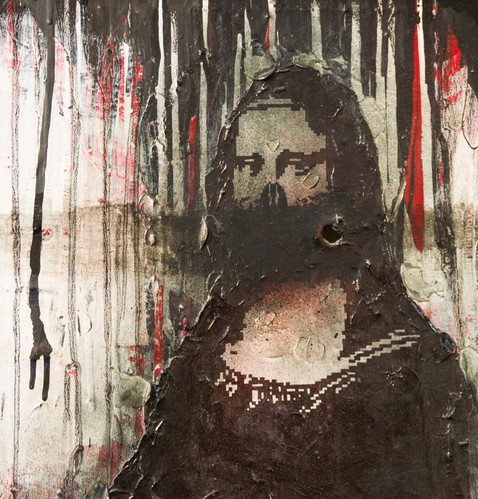 Gyarmati Zsolt (1968-): DeMonalisa 2015, vegyes technika, vászon, jelzés hátoldalon, keretben, 90x78cm 450 000 Ft