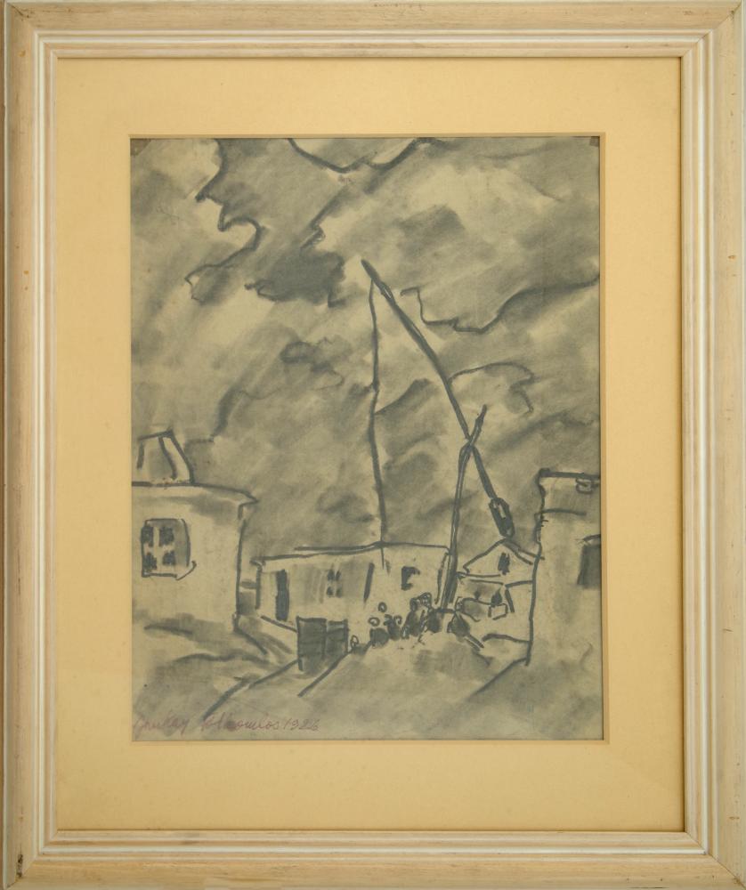Jankay Tibor (1899-1994): Tótkomlós 1926. Vegyes technika, papír, jelzés balra lenn, üvegezett keretben, 50×40 cm 36 000 Ft