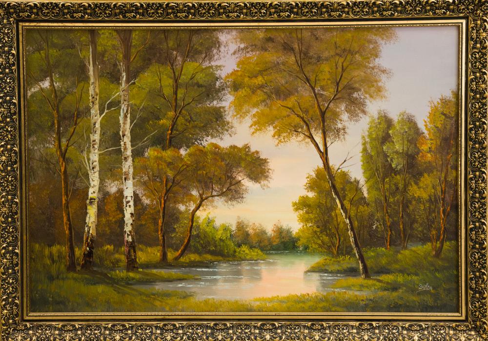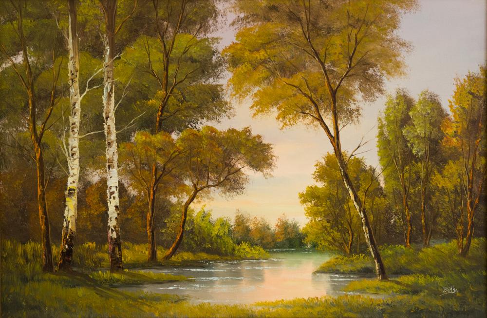 Bartha Tibor (?-): Vízparti táj. Olaj, vászon, jelzés jobbra lenn, keretben, 60×90 cm 24 000 Ft