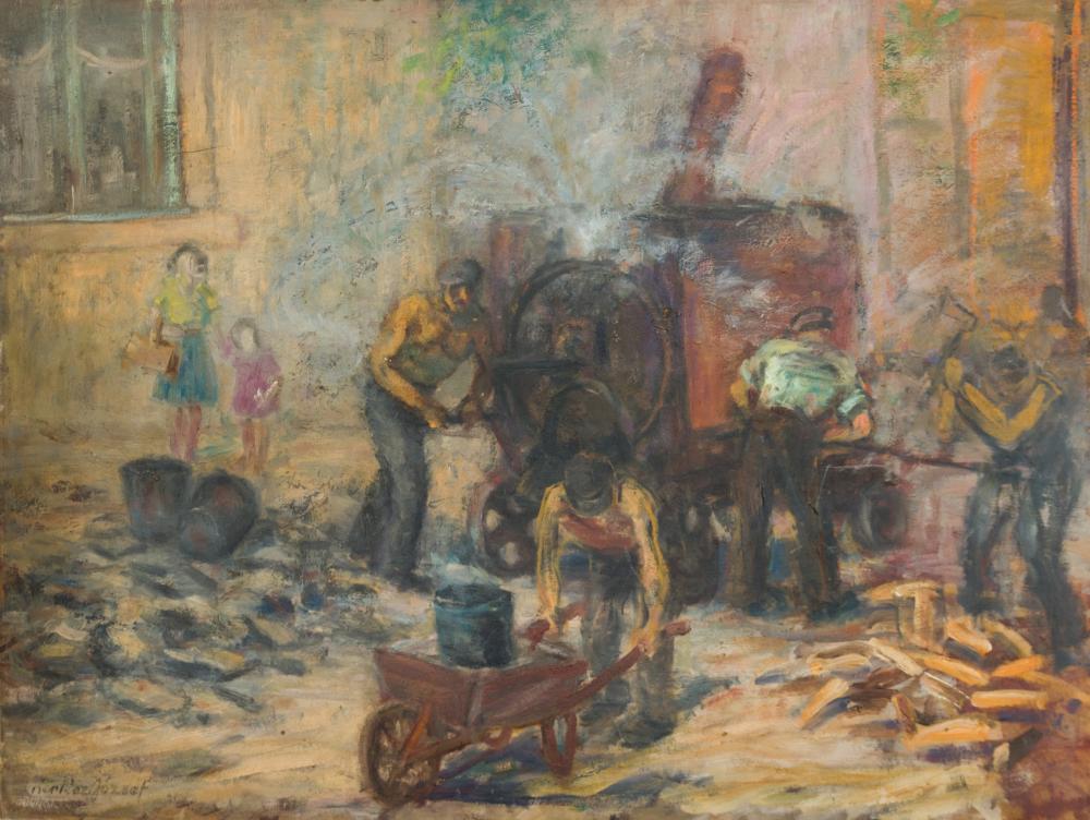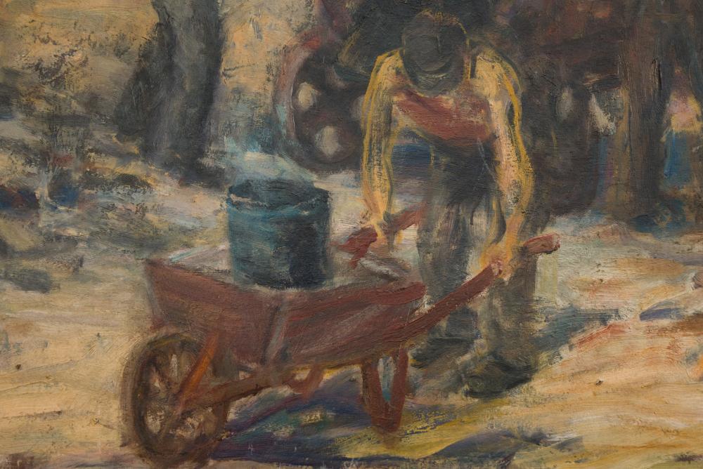 Kertész József (1905-1979): Aszfaltozás. Olaj, karton, vetemedéssel, jelzés balra lenn, 59×79 cm 10 000 Ft