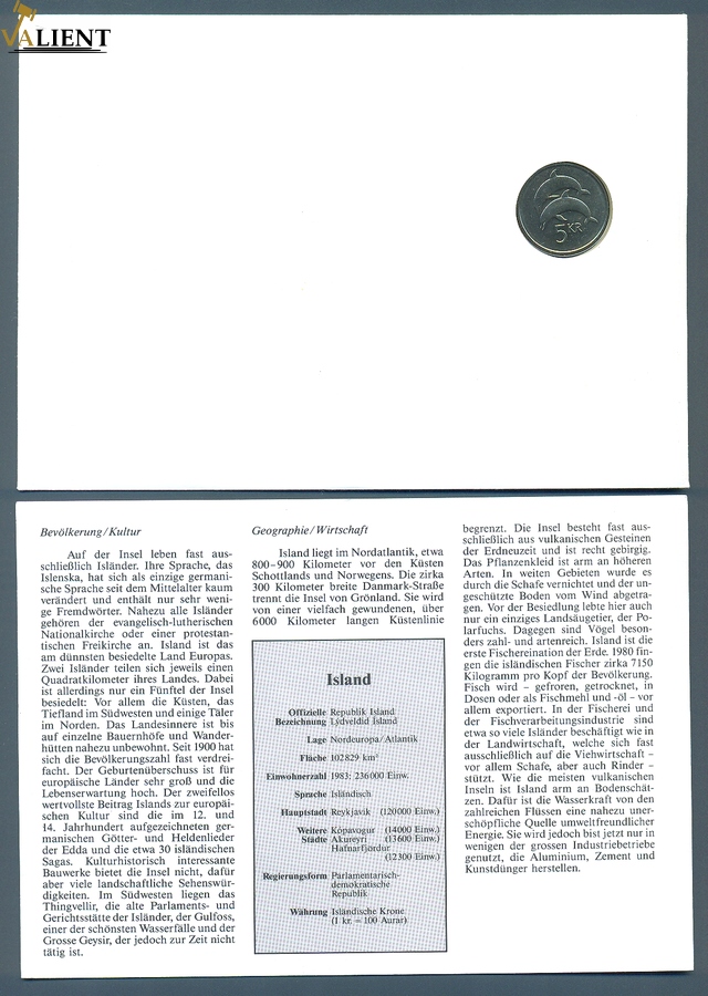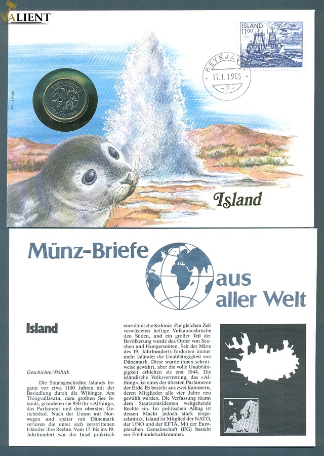 Izland 1984. 5 Krónur CuNi "Izland látványosságai" bélyeges borítékban, elsőnapi bélyegzéssel, német nyelvű leírással T/C:BU SCWC KM# 28 800 Ft