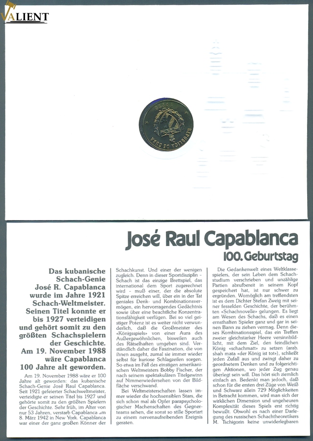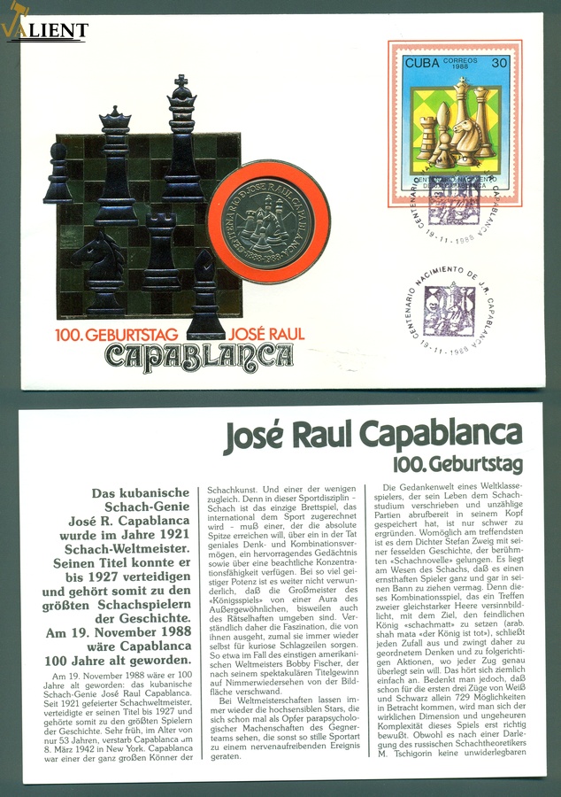 Kuba 1988. 1 Peso CuNi "José Raúl Capablanca születésének 100. évfordulója emlékére" bélyeges borítékban, elsőnapi bélyegzéssel, német nyelvű leírással T/C:BU SCWC KM# 200 3 200 Ft