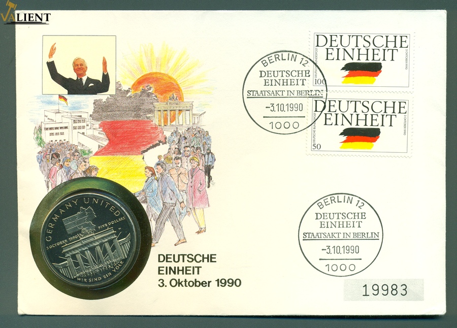 Marshall Szigetek 1990. 5 Dollars CuNi "Németország újra egyesítése" bélyeges borítékban, elsőnapi bélyegzéssel T/C:P SCWC KM# 33 2 000 Ft