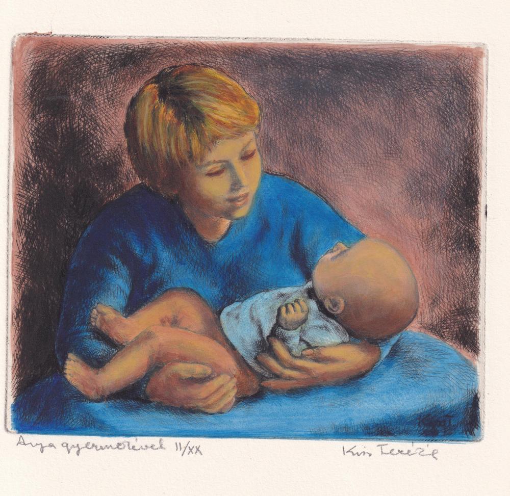 Kiss Terézia (1928-2016): Anya gyermekével. Színezett rézkarc, papír, jelzés jobbra lent. II/XX, 13,6×16 cm 5 000 Ft