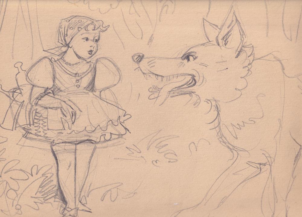 Friedrich Gábor (1916-1965): Piroska és a farkas (vázlat). Grafit, papír, jelzés nélkül, 24×32 cm 8 000 Ft