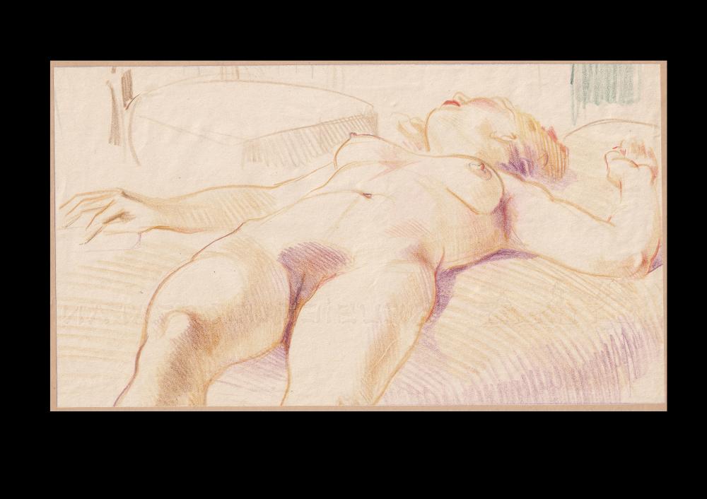 Ismeretlen alkotó: Fekvő női akt. Színes ceruza, papír, 14×25 cm 9 000 Ft