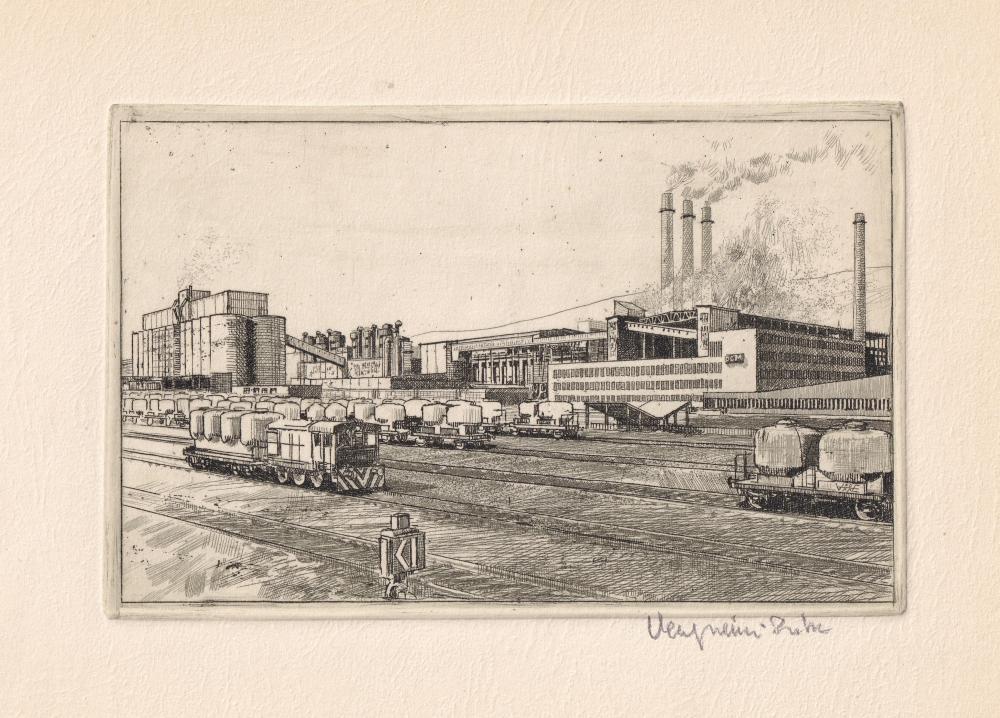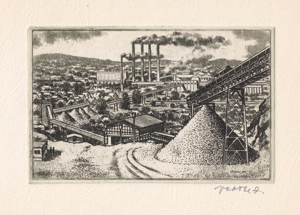 Cement és Mészművek. Több nyelvű propaganda füzet zománc vöröscsillaggal (egyedi). Három alkotóval (Vertel József, Gönczi Béla, Veszprémi Endre). 13 db rézkarc, papír, mindegyik jelezve, 8×13 cm (13×) 20 000 Ft