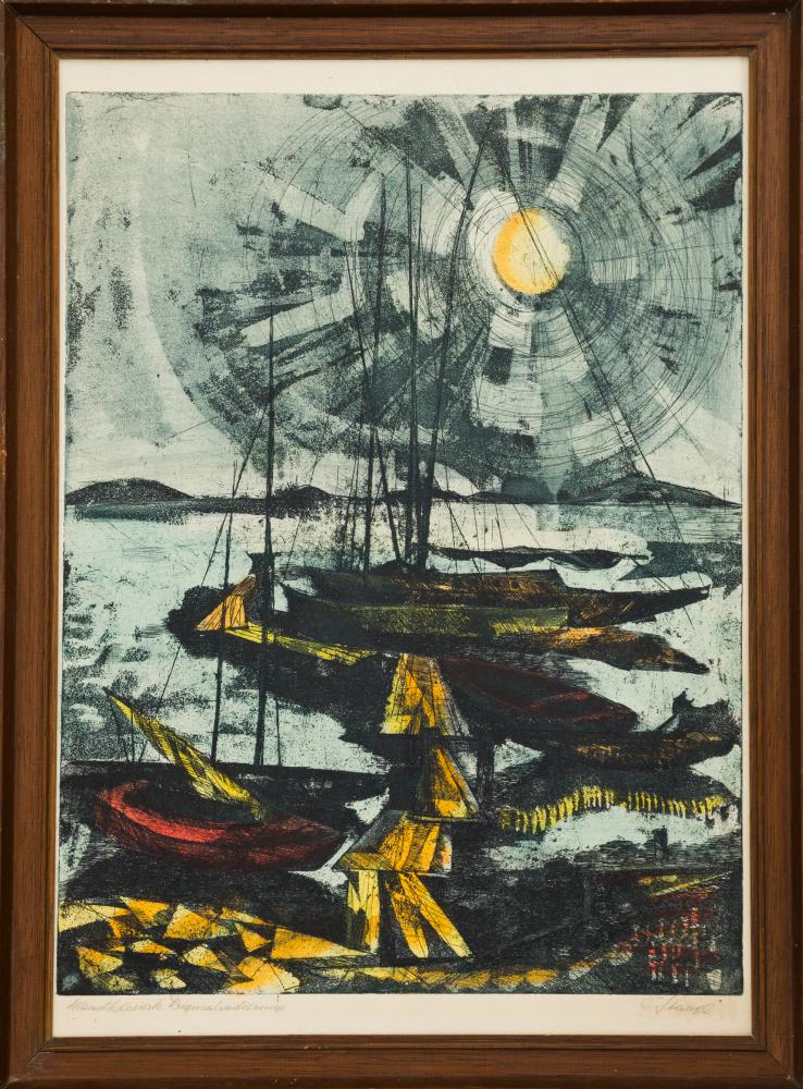 Reinhard Stangl (1950-): Vitorlások a tavon. Színezett rézkarc, papír, jelzés jobb lent, keretben, 39x29,5 cm 8 000 Ft