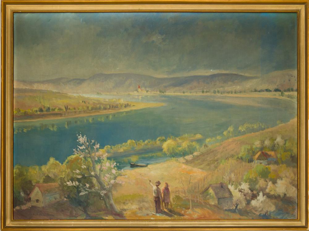 Bokor Béla János (?-?): Dunakanyar. Olaj, farost, jelzés balra lenn, kopásnyomokkal, 70×95 cm 50 000 Ft