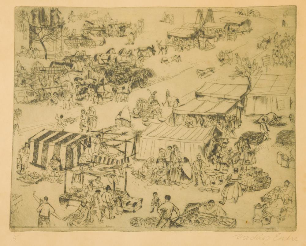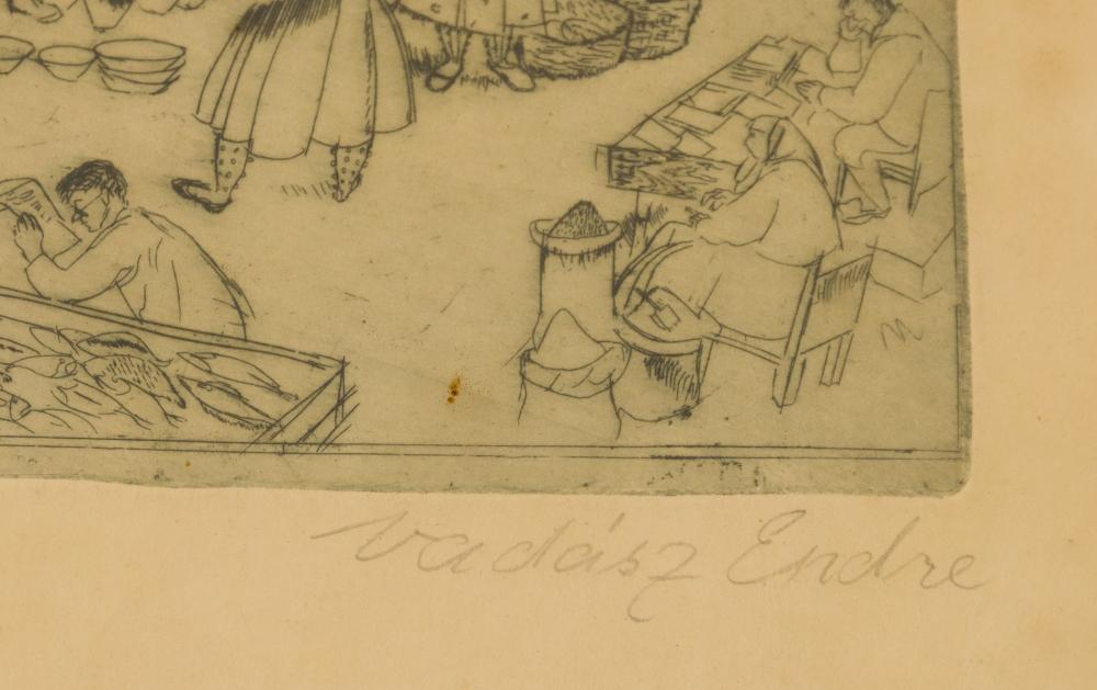 Vadász Endre (1901-1944): Piac. Rézkarc, papír, jelzés jobbra lenn, 20×25 cm, üvegezett keretben 10 000 Ft
