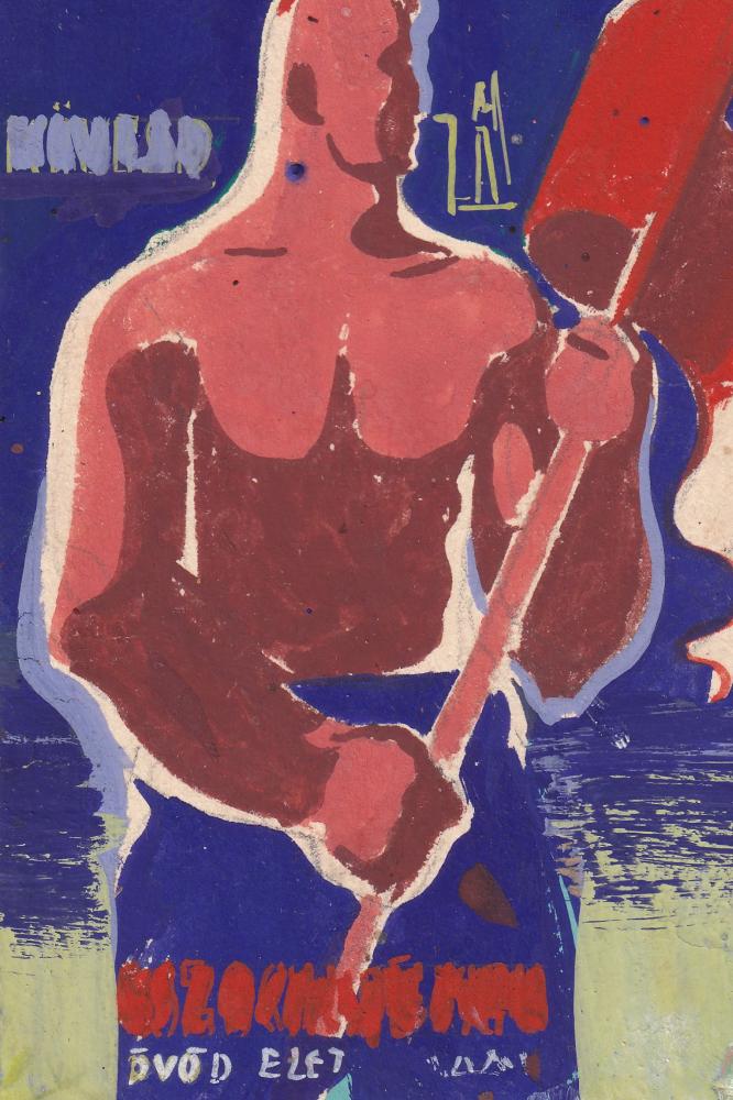 Bedő István (?-?): Feltehetően a Magyar Szociáldemokrata Párt meg nem valósult plakátterve. Gouache, karton, jelzés jobbra lenn (B) kopásnyomokkal, 10×6,5 cm 12 000 Ft