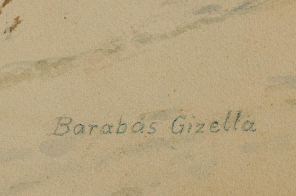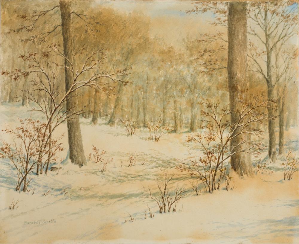 Barabás Gizella (1893-1985): Téli erdő részlet. Akvarell, papír-karton, jelzés balra lenn, fakulással, 49×60 cm 16 000 Ft