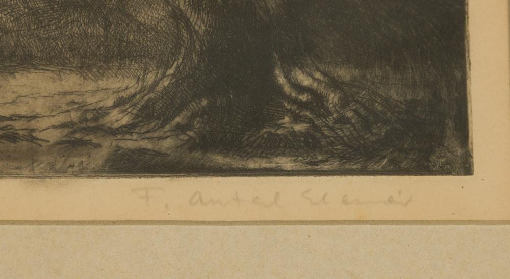 Felsőgelléri Antal Elemér (1896-1995): Platánfa álma (Ady Endre). Rézkarc, papír, üvegezett hibás keretben, 25×22 cm 3 000 Ft