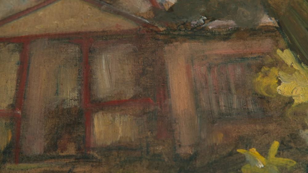 Dudits Andor (1866-1944): Udvar 1939. Olaj, farton, jelzés jobbra lenn, modern keretben, 29,5×24,5 cm 38 000 Ft