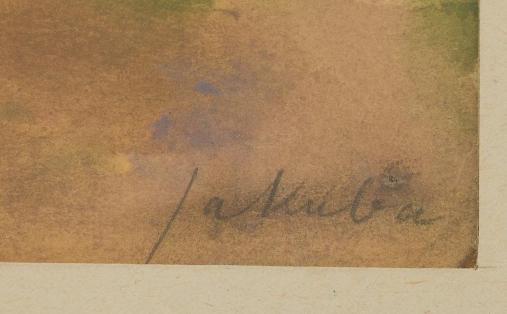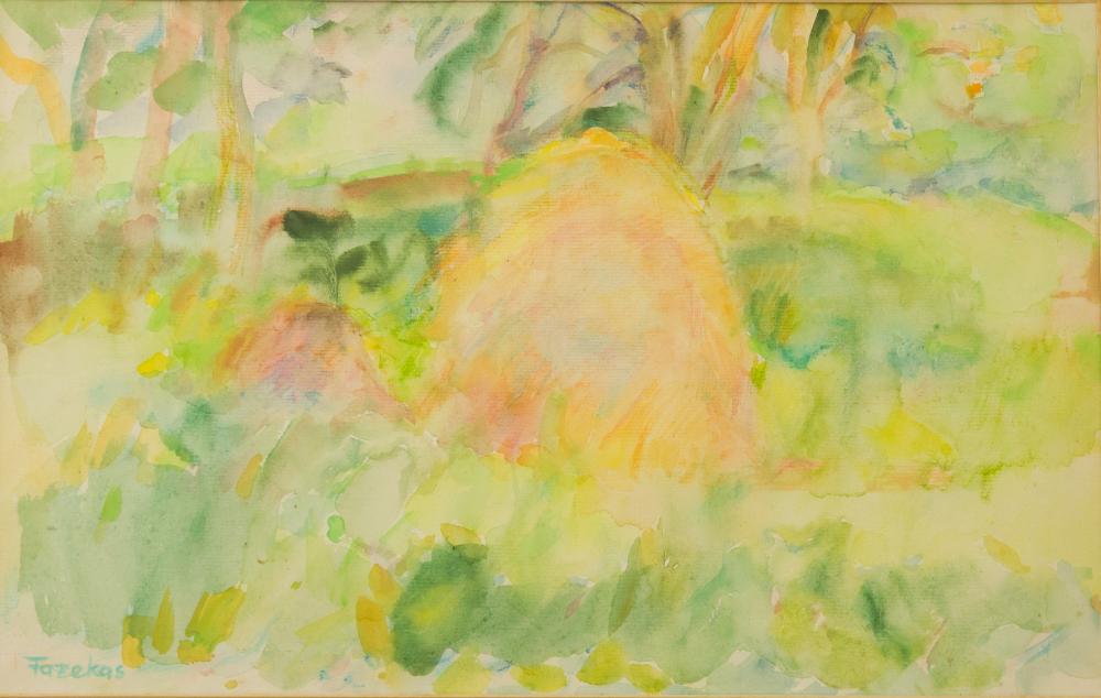 Jakuba János (1909-1974): Szénaboglya. Vegyes technika, papír, üvegezett modern keretben, 29×42 cm 28 000 Ft