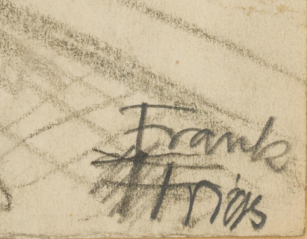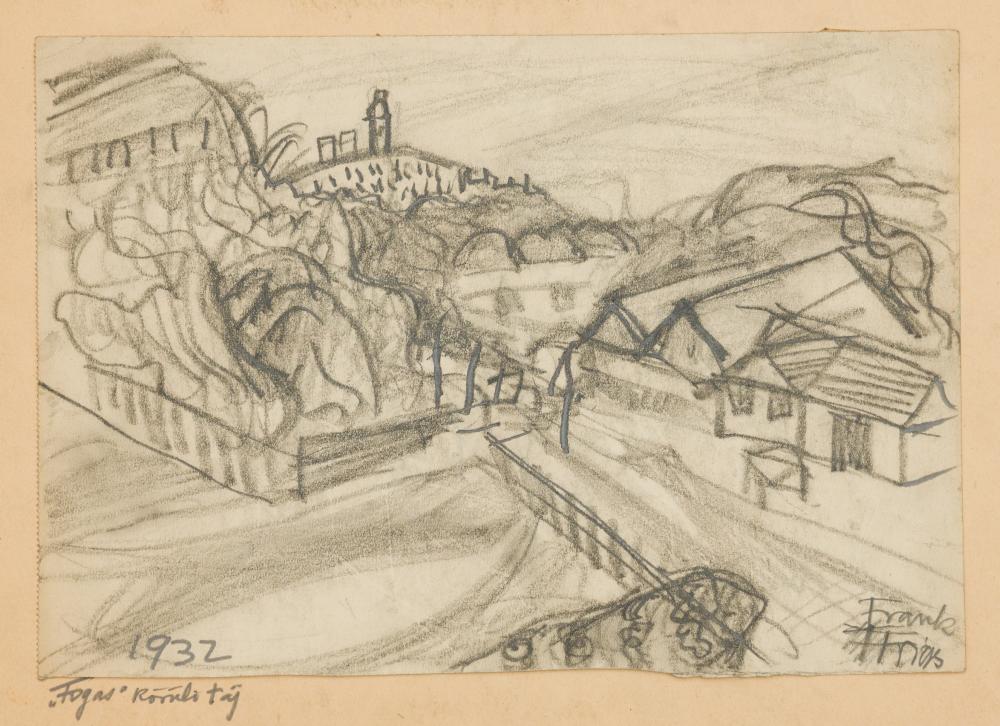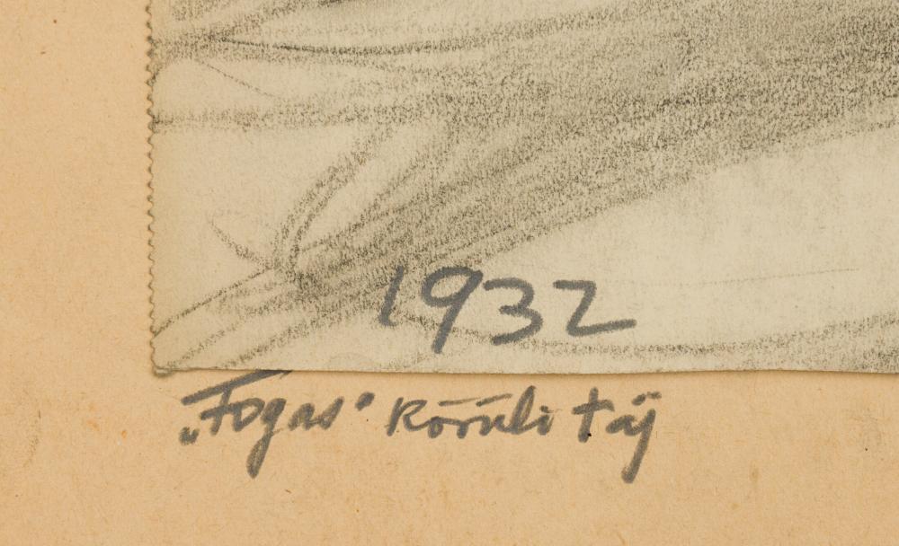 Frank Frigyes (1890-1976): "Fogas" (fogaskerekű?) körüli táj. Szén, papír, jelezve jobbra lenn, hátoldalán vázlat rajz, 20×28 cm 22 000 Ft