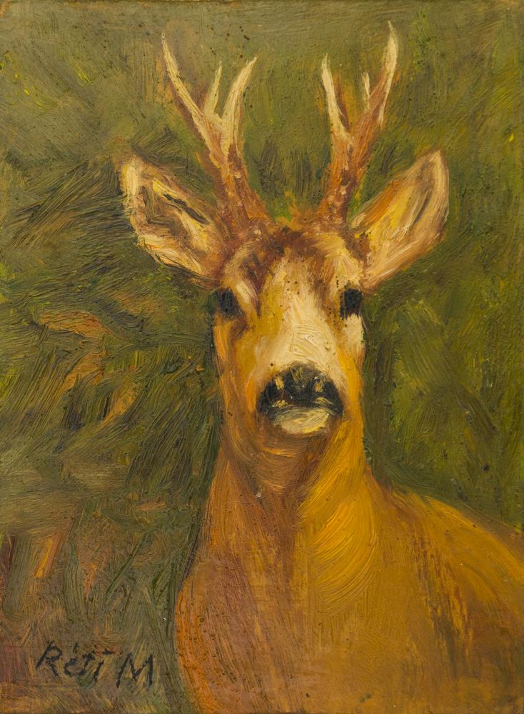 Réti Mátyás (1922-2002): Őzbak. Olaj, farost, jelzés balra lenn, 14×18,5 cm 8 000 Ft