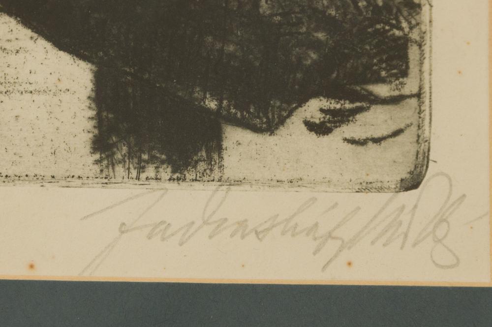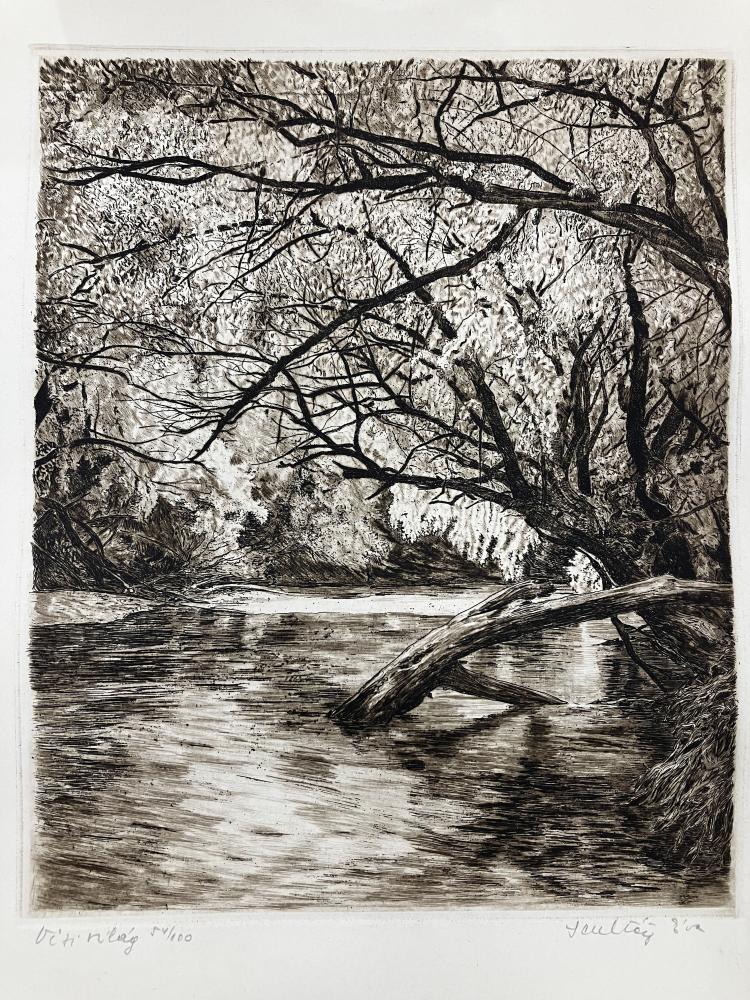 Farkasházy Miklós (1895-1964): Vág partján. Rézkarc, papír, jelzés jobbra lenn, üvegezett keretben, 18×24 cm 6 000 Ft