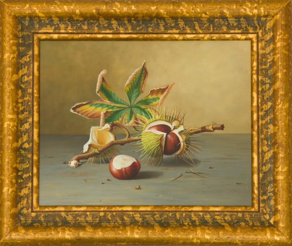 B.W.A. jelzéssel: Gesztenyés csendélet. Olaj, fa, jelzés jobbra lenn, modern keretben, 23.5×29,5 cm 18 000 Ft