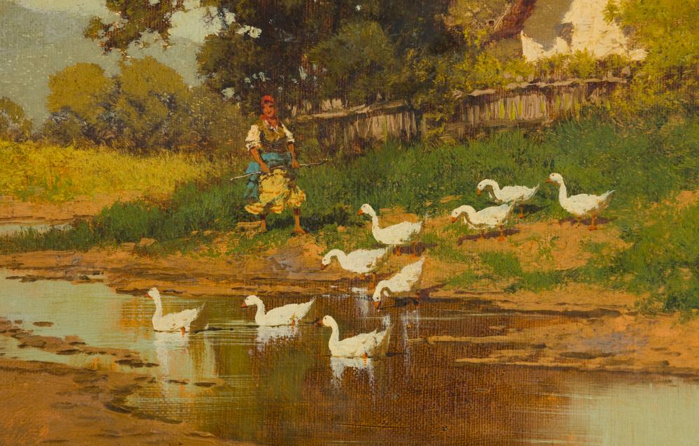 Neogrády László (1896-1962): Libapásztorlány. Olaj, vászon, jelzés balra lenn, antik keretben, 40×50 cm 50 000 Ft