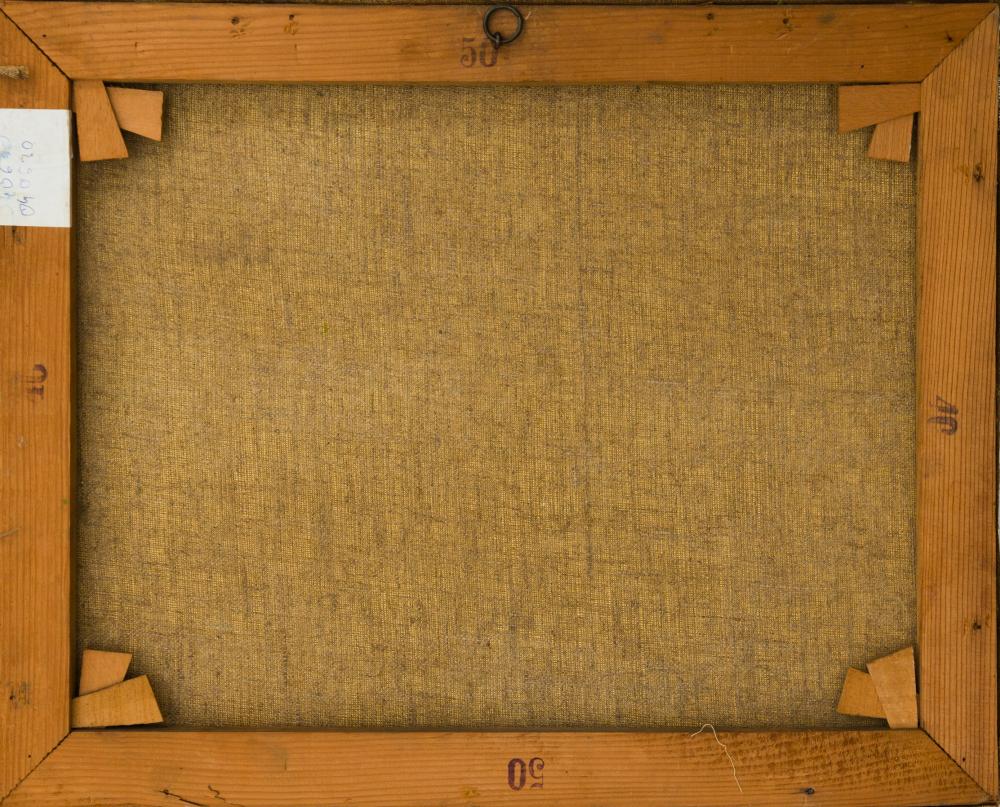 Ballagó Imre (1915-1997): Szürkületkor. Olaj, farost, jelzés jobbra lenn, Képcsarnok raglappal, kopásnyomokkal, 50×60 cm 8 000 Ft