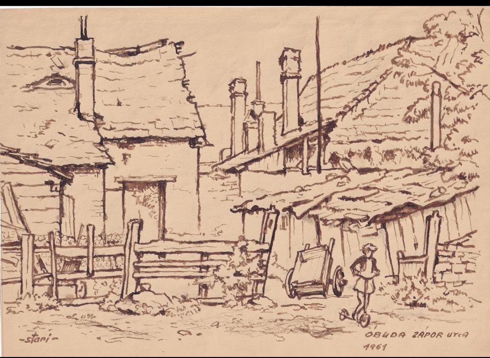 Sostarics Lajos (1896-1968): Óbuda Zápor utca (1961). Tus, papír, jelzés jobbra lenn, 21×29 cm 9 000 Ft