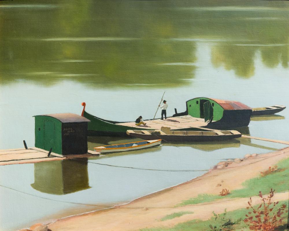 Pólya Iván (1889-1939): Bárkák a Tiszán, olaj, karton, jelzés középen balra, keretben, 40x50 cm 300 000 Ft