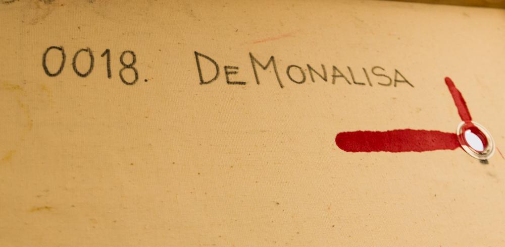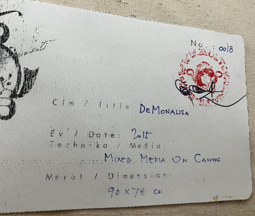 Gyarmati Zsolt (1968-): DeMonalisa 2015, vegyes technika, vászon, jelzés hátoldalon, keretben, 90x78cm 450 000 Ft