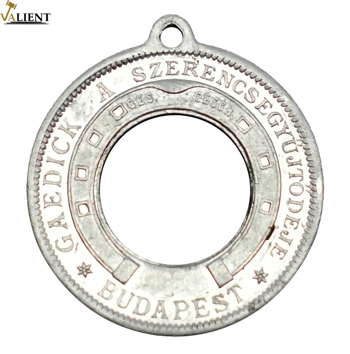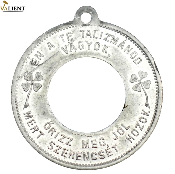 1901KB 1 Fillér Br (Adamo K1) fémpénz alumínium szerencse talizmán foglalata. "Én a Te Talizmánod vagyok - Őrizz meg jól mert szerencsét hozok / Gaedickea Szerencsgyűjtödéje - Budapest" körirattal, szép állapotban (33.2mm/2.59g)