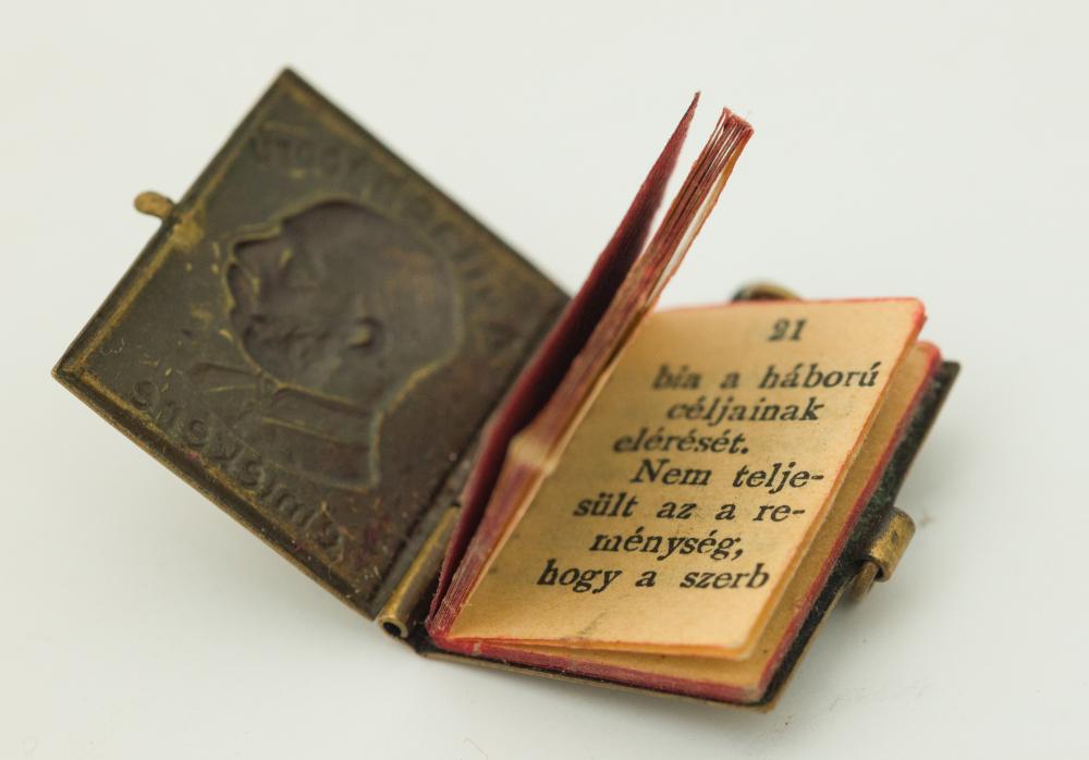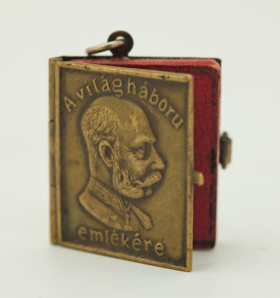 1915. Ferenc József: Népeimhez! A királyi szózat a nemzethez 1914. július 28-án. Minikönyv medál dombornyomott réz borítóval, 'A világháború emlékére' felirattal (24x22 mm.), akasztóval 32 000 Ft