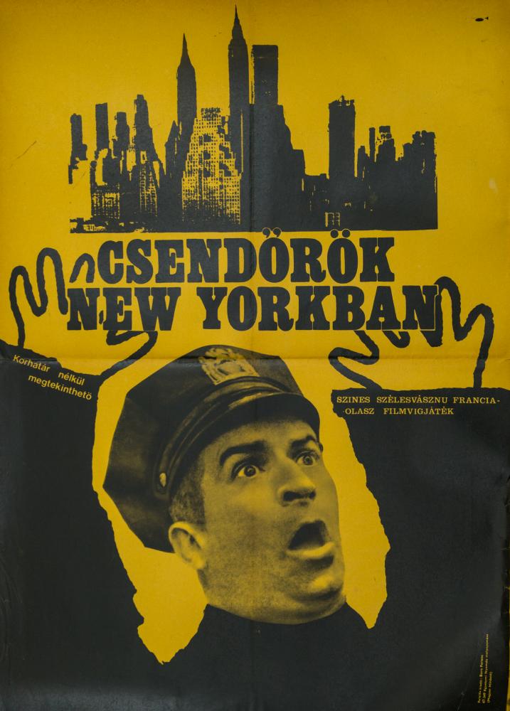 Csendőrök New Yorkban (1965). Rendezte: Jean Girault. Szereplők: Louis de Funès, Michel Galabru, Jean Lefebvre, Billy Kearns. Plakáttervező: Finta József (1967). Hajtott, felcsavarva, szélén apró szakadásokkal, 56,5×41 cm 18 000 Ft