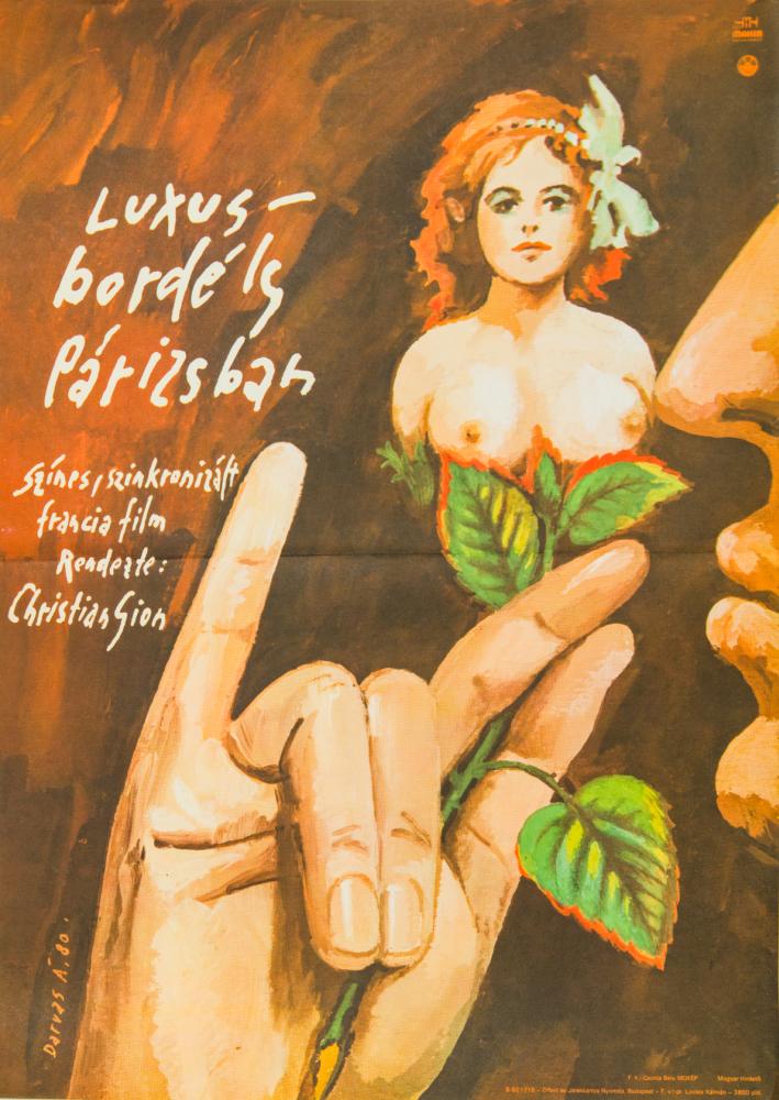 Luxusbordély Párizsban (1978). Rendezte: Christian Gion. Szereplők: Catherine Alric, Catherine Serre, Jacques François, Francis Huster. Plakáttervező: Darvas Árpád (1980). Hajtott, felcsavarva, 57×41 cm 6 000 Ft