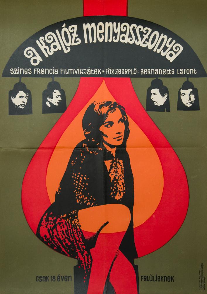 A kalóz menyasszonya (1969). Rendezte: Nelly Kaplan. Szereplők: Bernadette Lafont, Michel Constantin, Claire Maurier, Georges Géret. Plakáttervező: NIncs feltüntetve (1971). Hajtott, felcsavarva, 56,5×40,5 cm 6 000 Ft